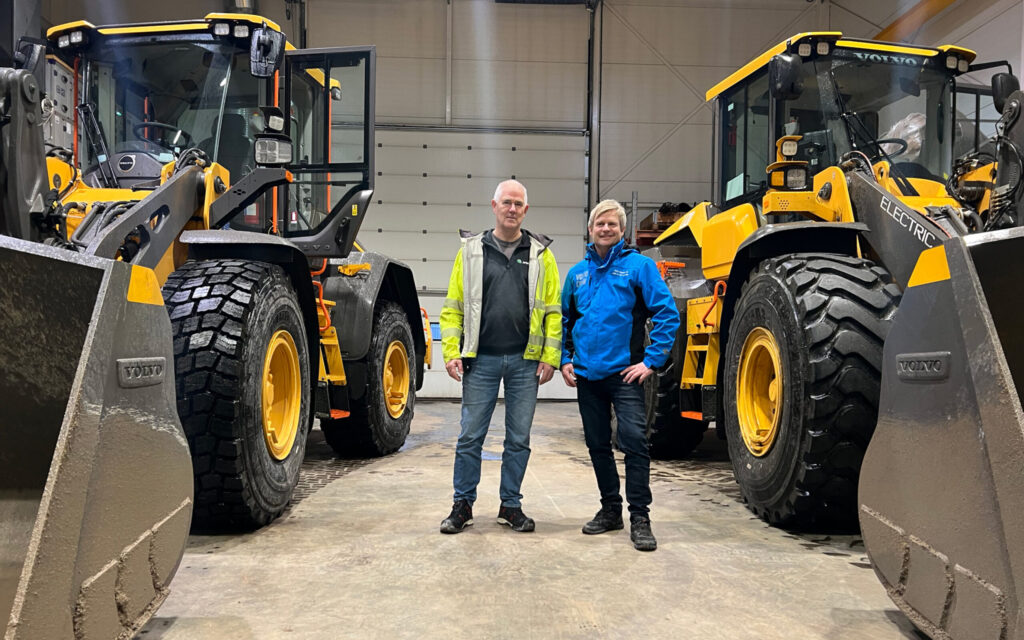Driftsleder Harry Hansen fra Avfall Sør, og distriktssjef Kjell Arne Løyning fra Volvo, under demonstrasjon av helelektriske hjullastere på Støleheia.