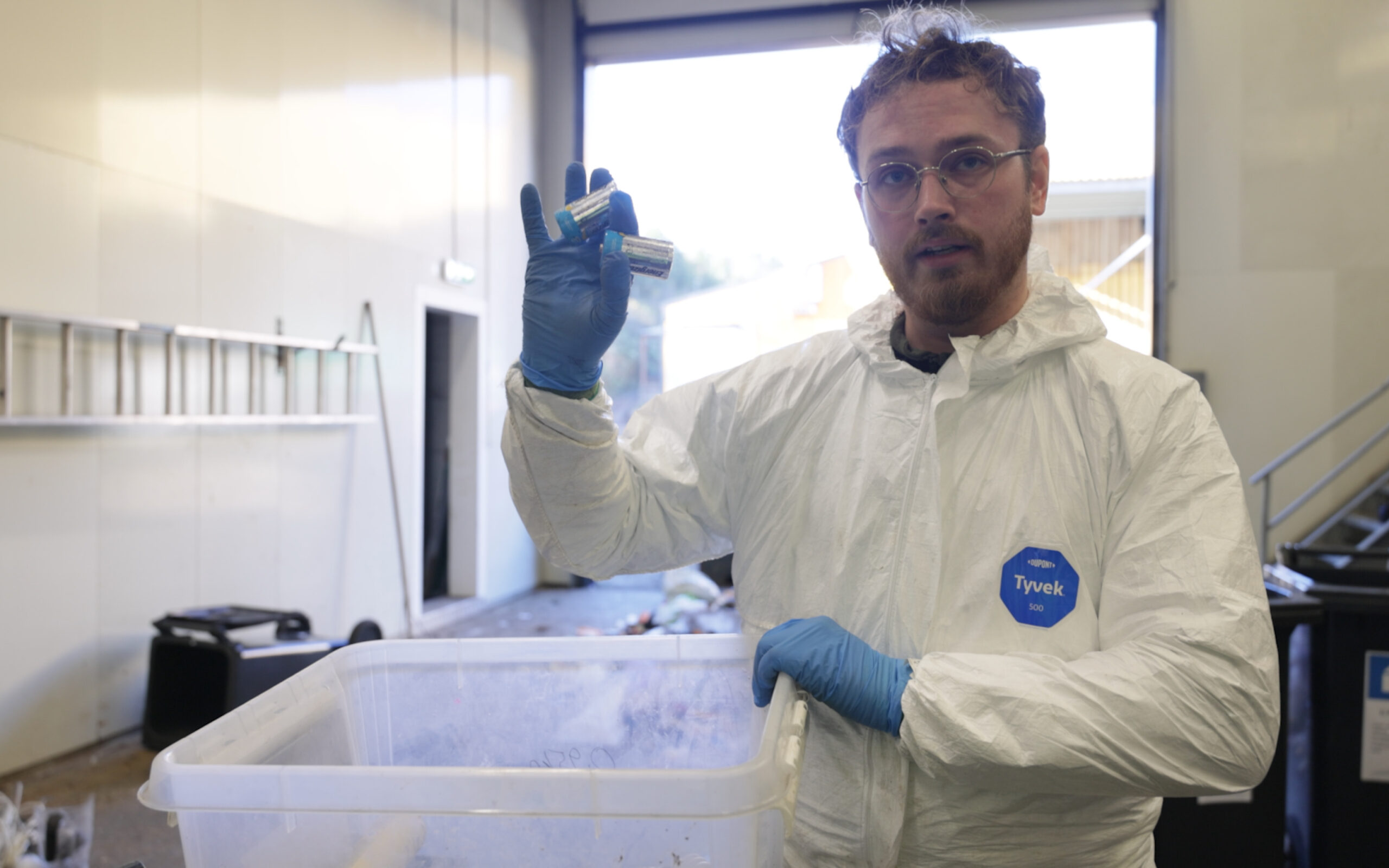 Elektronikk og farlig avfall skal ikke kastes i restavfallet. Sorteringsmedarbeider Ferdinand Arntzen Elmenhorst viser frem noen batterier som er funnet underveis.